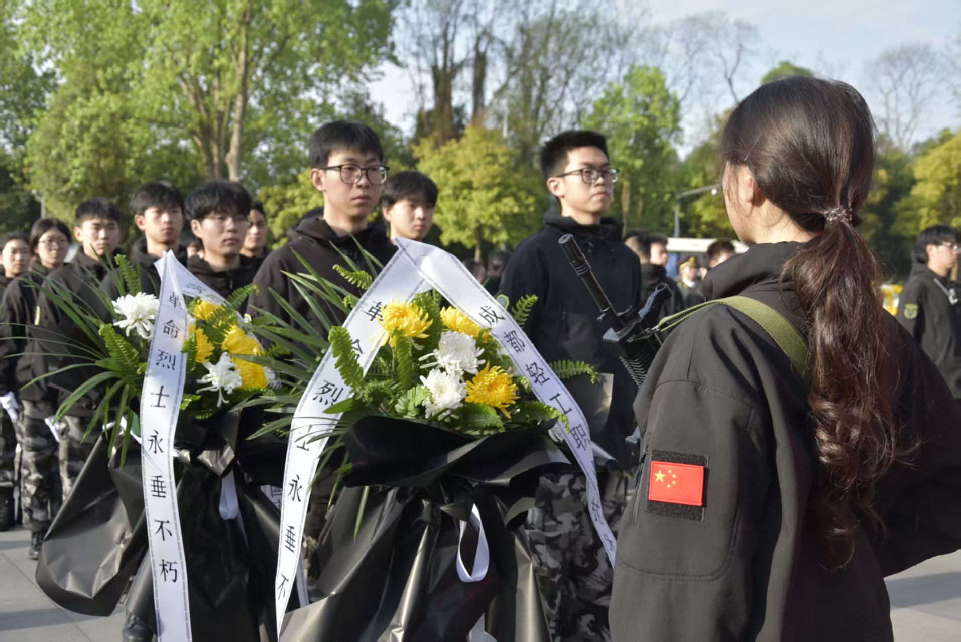 清晨,祭扫仪式正式开始。标兵有序就位,仪仗队迈着稳健有力的步伐行进至指定区域,伴随着深情的花篮进行曲,花篮组缓步走向革命烈士纪念碑,郑重敬献花篮,表达对革命先烈的深切缅怀与崇高敬意。随后,现场展开鲜艳的五星红旗,全体人员肃立注目,齐声高唱国歌。国歌奏响完毕,全体人员脱帽肃立,为革命先烈默哀三分钟,以最庄重的方式寄托哀思。默哀结束后,各高校队长、教官及学生代表依次上前,向烈士敬献鲜花,用洁白花束告慰英烈忠魂,传承先烈精神。