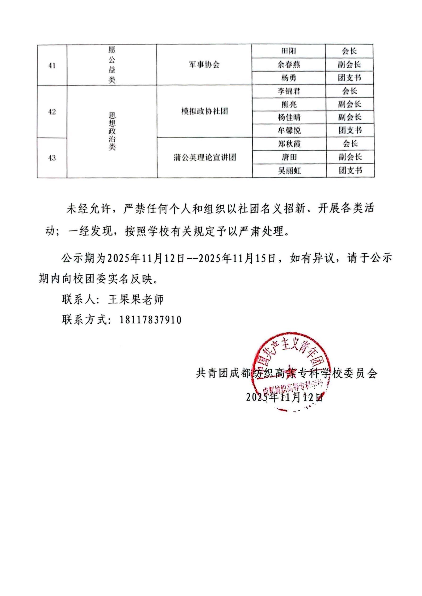 关于公布2025-2026学年学生社团负责人聘用结果的公示