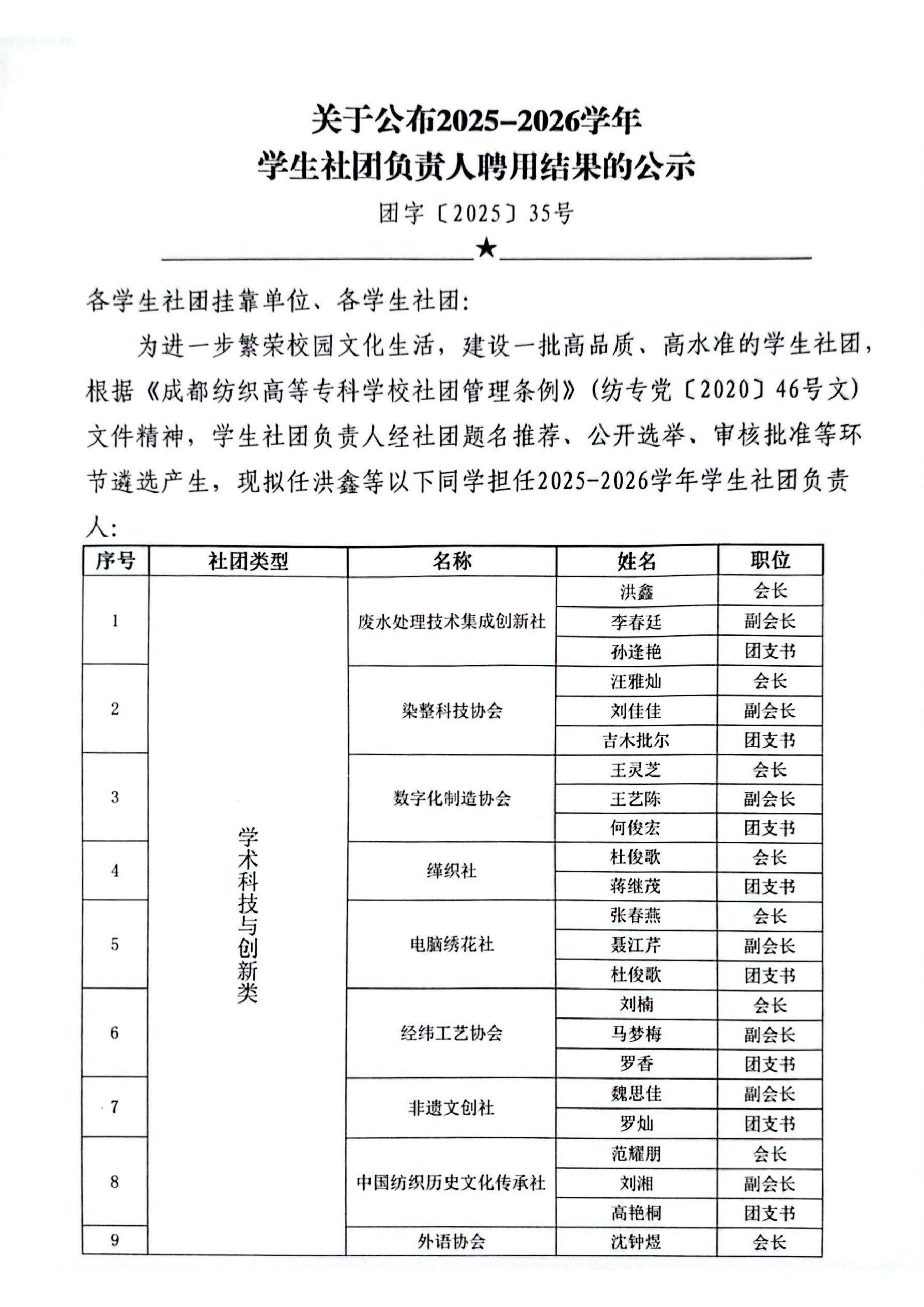 成都纺织高等专科学校关于2024-2025学年学生社团年审及星级评定结果公示