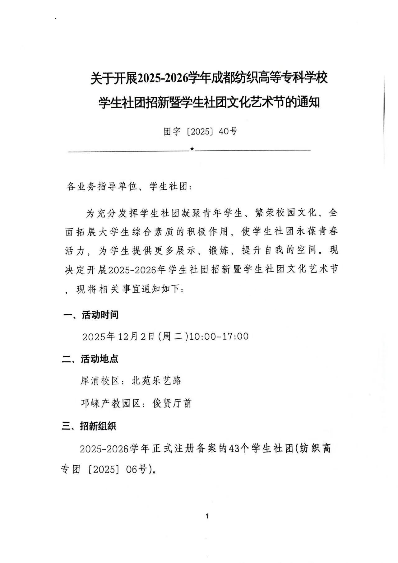 关于开展2025-2026学年成都纺织高等专科学校学生社团招新暨学生社团文化艺术节的通知