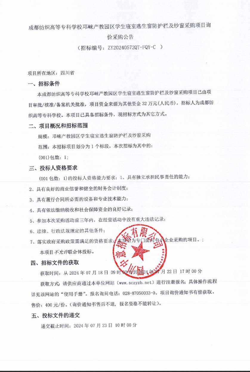 成都纺织高等专科学校邛崃产教园区学生寝室逃生窗防护栏及纱窗采购项目询价采购公告