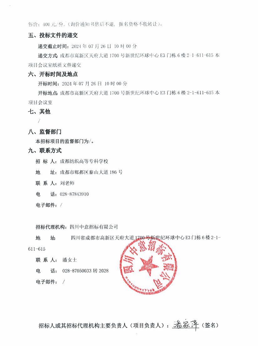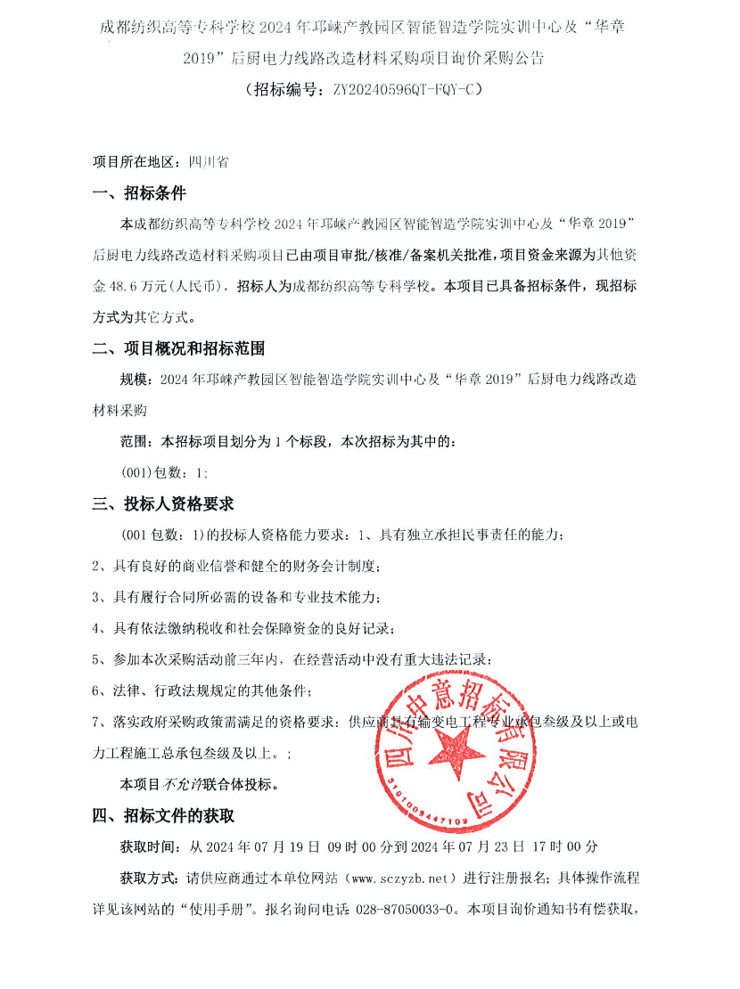 成都纺织高等专科学校2024年邛崃产教园区智能智造学院实训中心及“华章2019”后厨电力线路改造材料采购项目询价采购公告