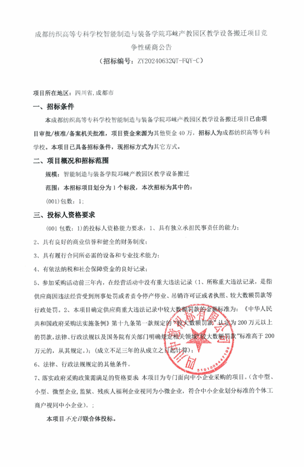 成都纺织高等专科学校智能制造与装备学院邛崃产教园区教学设备搬迁项目竞争性磋商公告