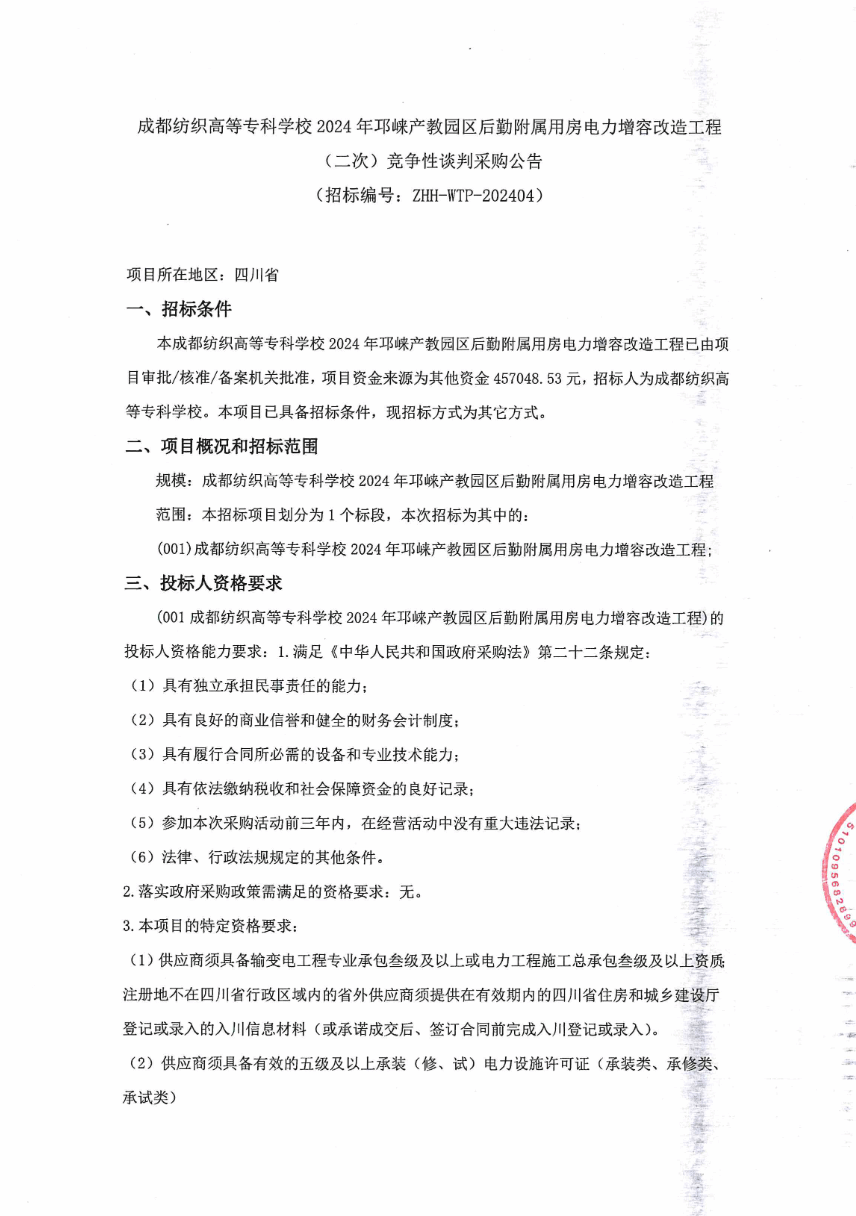 成都纺织高等专科学校2024年邛崃产教园区后勤附属用房电力增容改造工程(二次)竞争性谈判采购公告