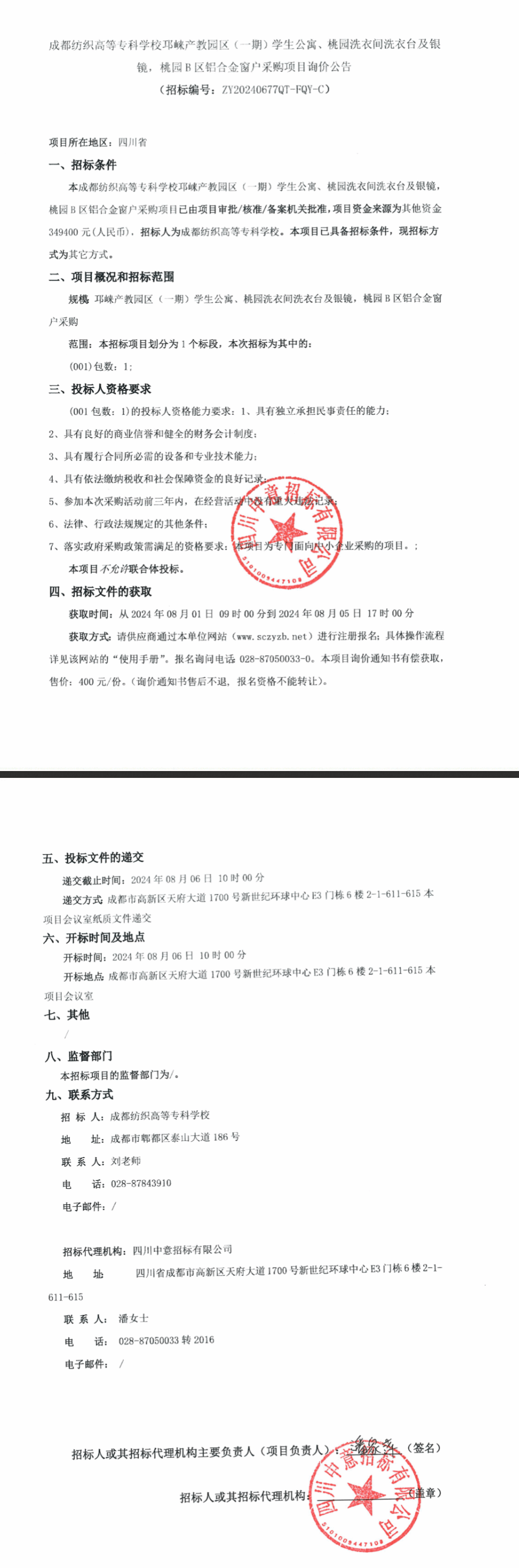 成都纺织高等专科学校邛崃产教园区(一期)学生公寓、桃园洗衣间洗衣台及银镜,桃园B区铝合金窗户采购项目询价公告