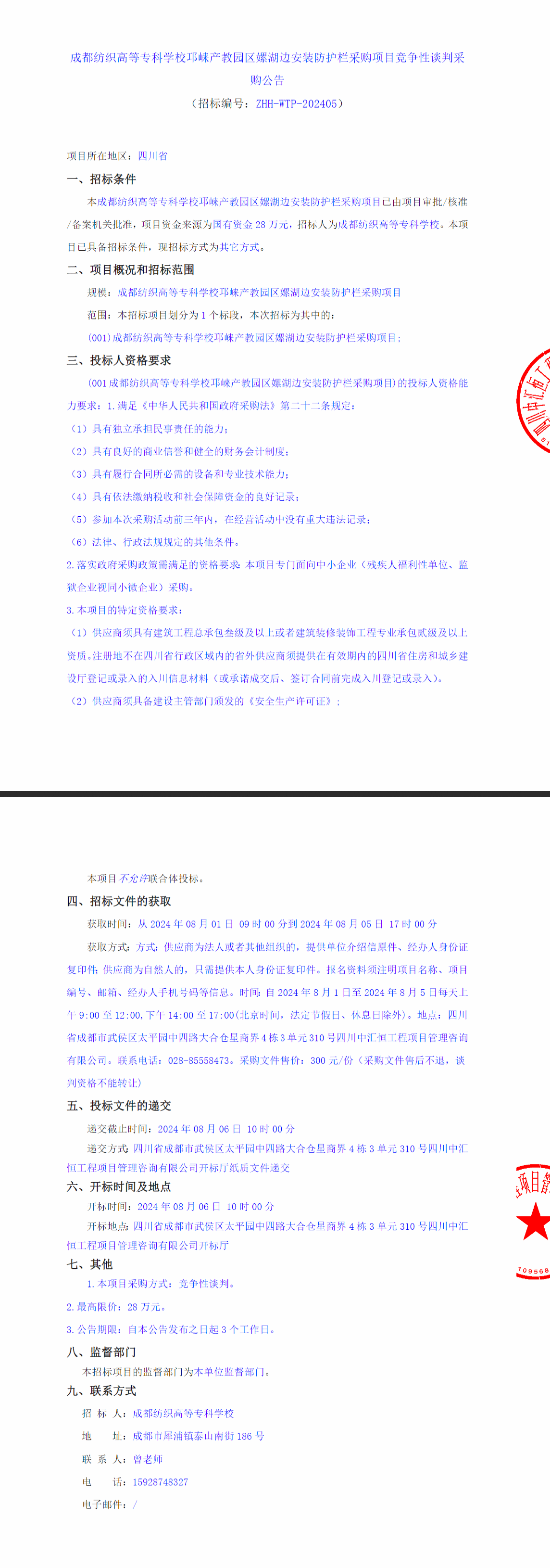 成都纺织高等专科学校邛崃产教园区嫘湖边安装防护栏采购项目竞争性谈判采购公告