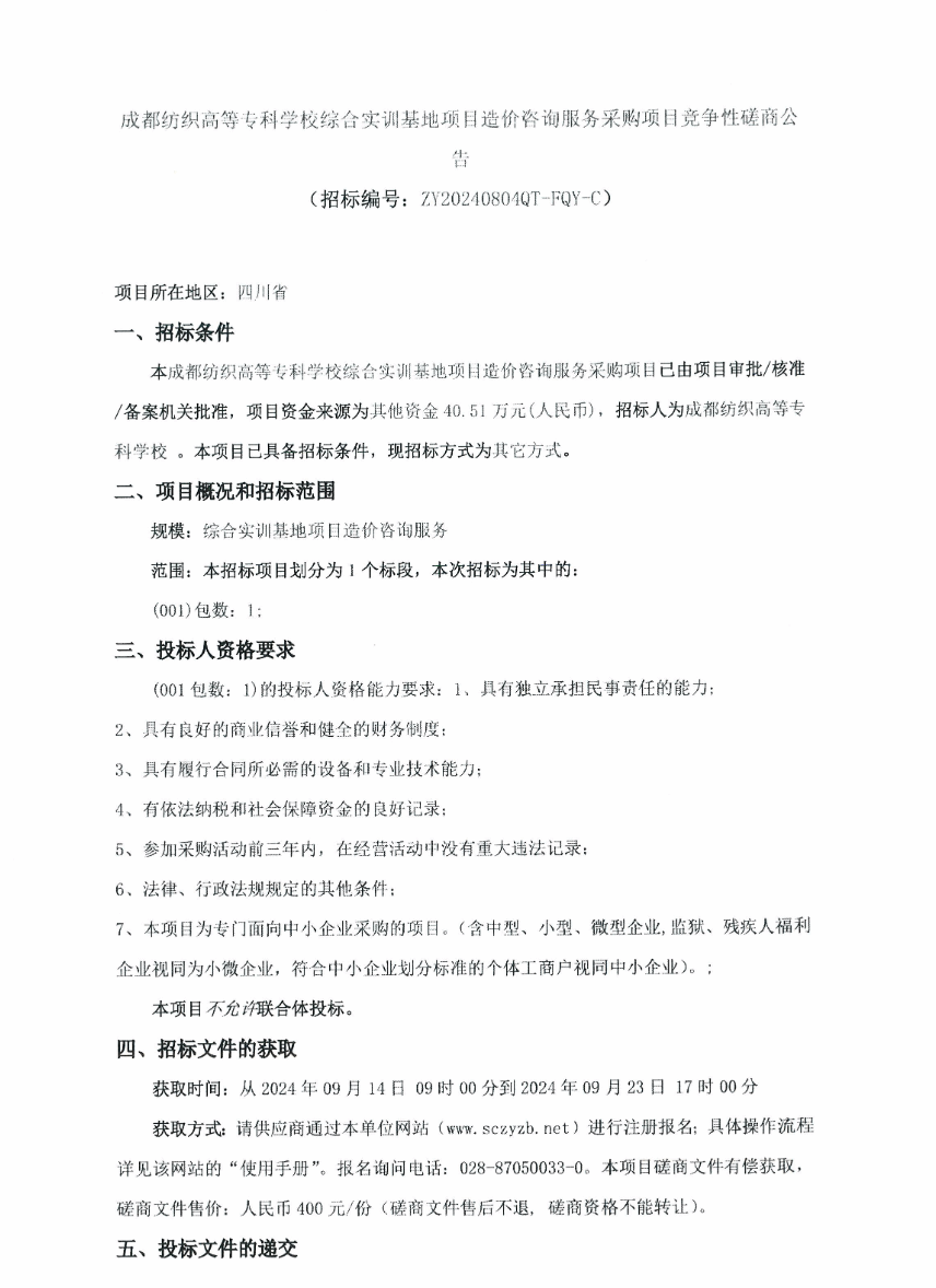 成都纺织高等专科学校综合实训基地项目造价咨询服务采购项目竞争性磋商公告