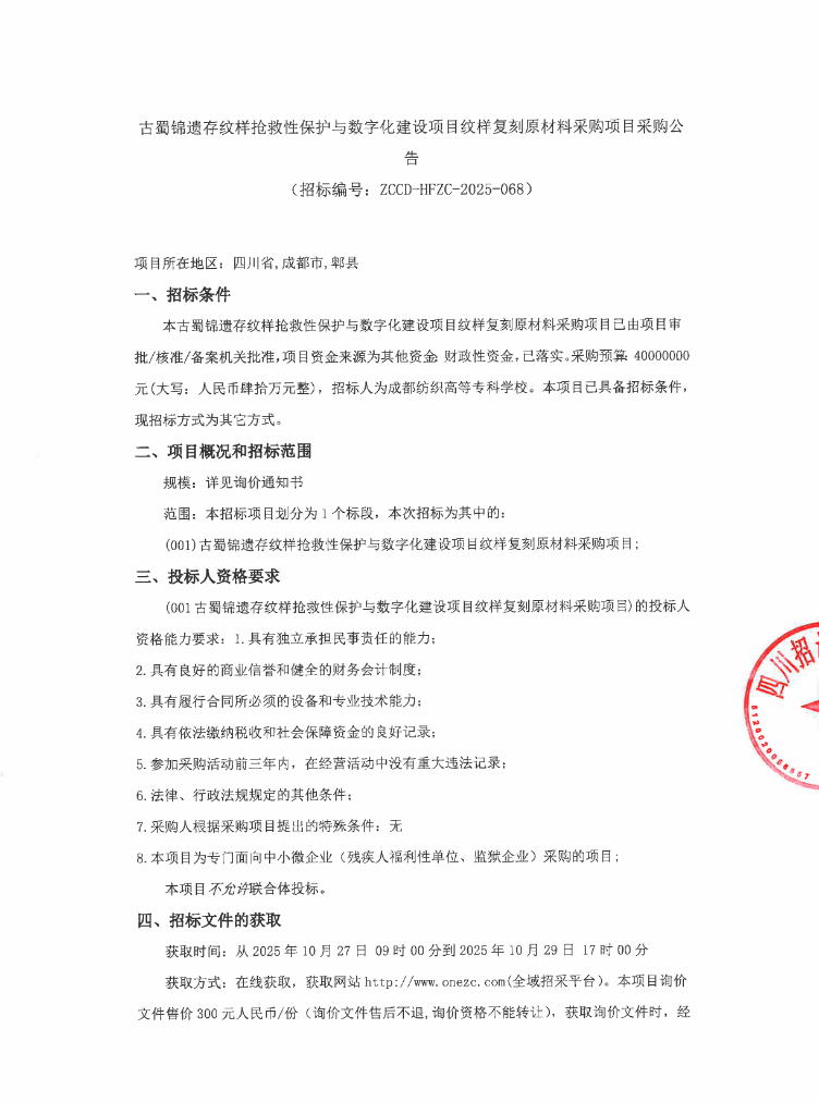古蜀锦遗存纹样抢救性保护与数字化建设项目纹样复刻原材料采购项目采购公吿