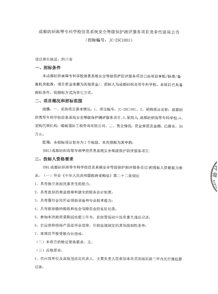 成都纺织高等专科学校信息系统安全等级保护测评服务项目竞争性磋商公告