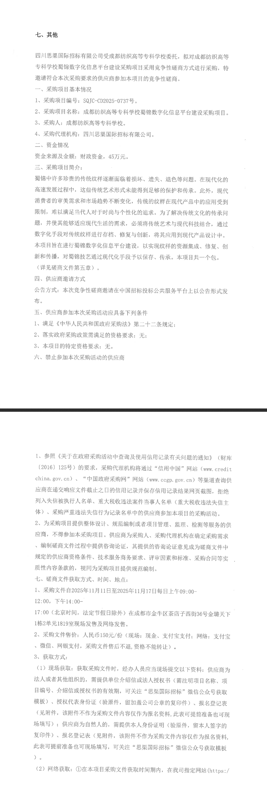 成都纺织高等专科学校蜀锦数字化信息平台建设采购项目竞争性磋商采购公告