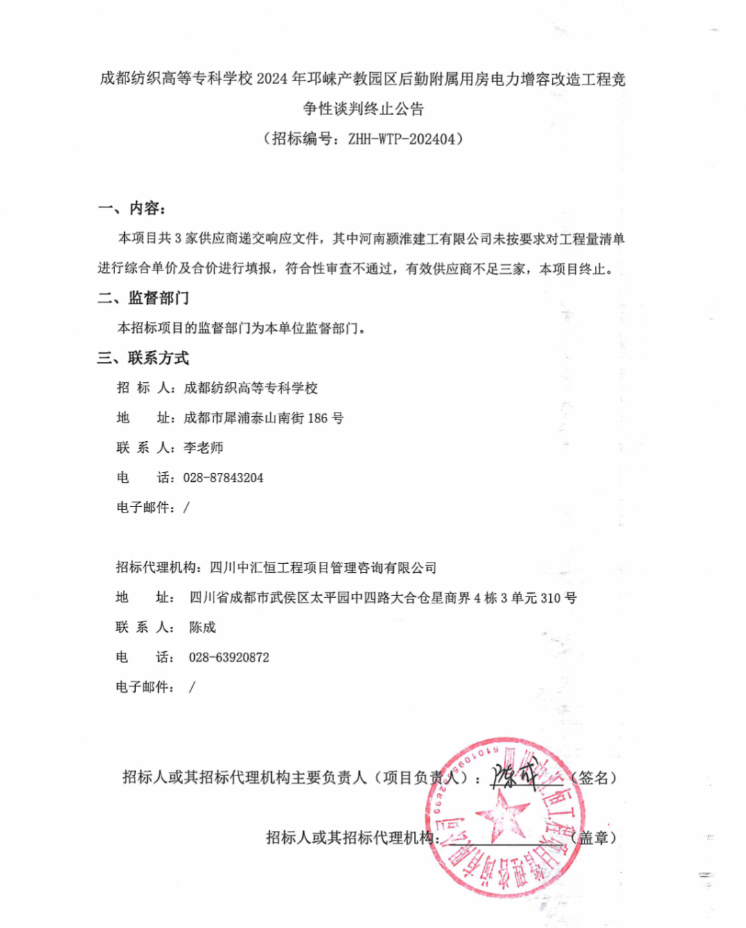成都纺织高等专科学校2024年邛崃产教园区后勤附属用房电力增容改造工程竞争性谈判终止公告