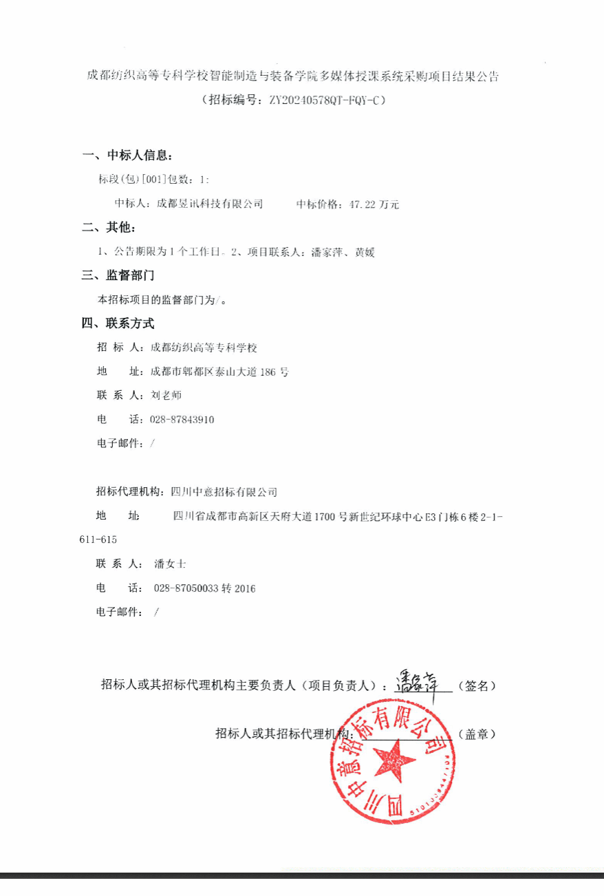 成都纺织高等专科学校智能制造与装备学院多媒体授课系统采购项目结果公告