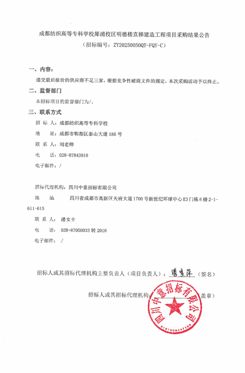 成都纺织高等专科学校犀浦校区明德楼直梯建造工程项目采购结果公告