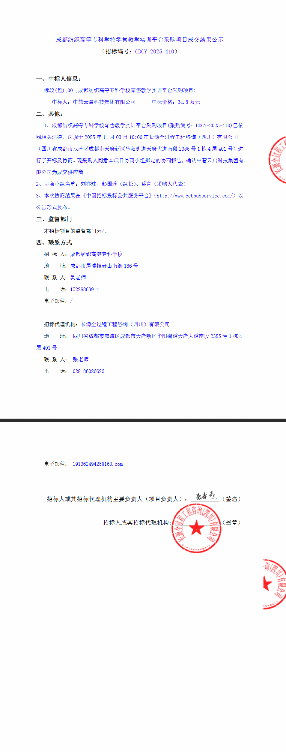成都纺织高等专科学校零售教学实训平台采购项目成交结果公示