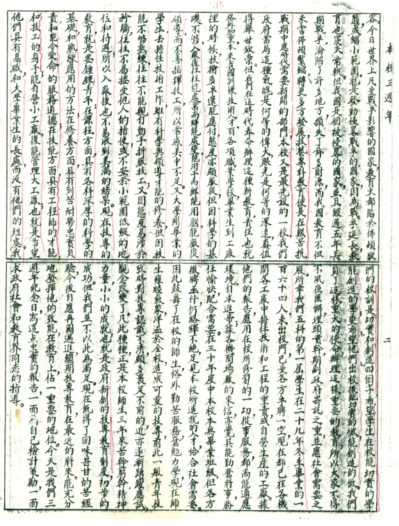 本校创设宗旨,在造就各项专门技术人才,以应生产建国的需要,在抗战军兴以后,物资艰难,生产事业,百端俱举,技术人才需要更切,所以本校在三年前战事最紧张的时期产生了。二十八年一月教育部令设本校,开始筹备四月二十四日起上课,到现在刚满三周岁,孔子说“三岁有成”,试检讨过去三年的成绩,虽距“有成”的程度尚远,但本校全体教职员领导着学生,却无时不兢兢业业,各尽了最大的努力,自然今后仍愿加倍的努力,以期达到“有成”的目的。