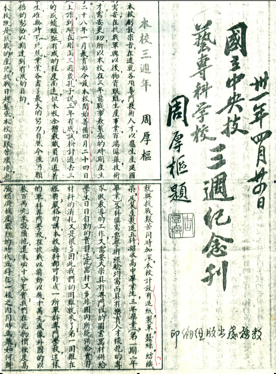 ——摘自《国立中央技艺专科学校三周纪念刊》(一九四二年四月二十四日,教务处出版组编印)