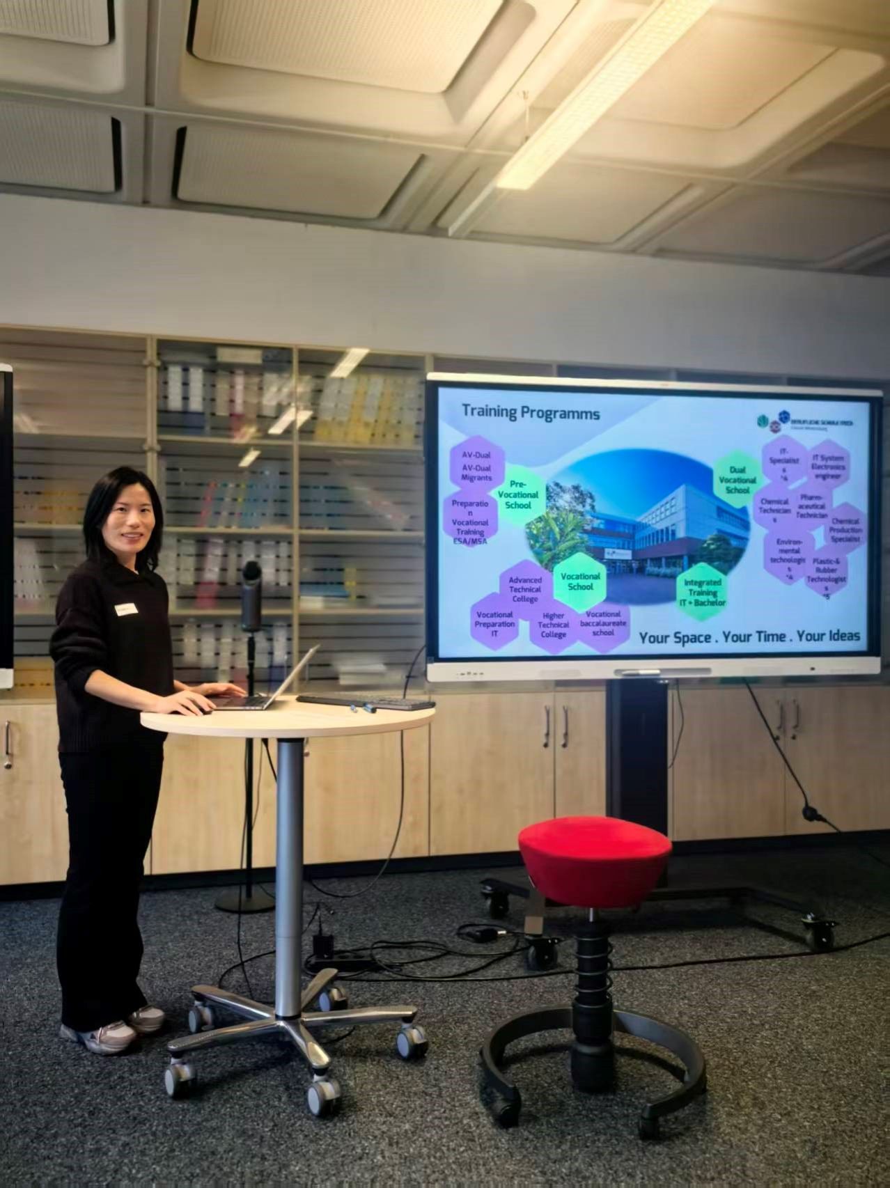 图8 蒋佳芯老师参观汉堡ITECH职业学校 此次培训是学校实施人才强校战略、深化职业教育国际合作、对接轻工纺织产业智能化升级需求的重要实践。学校将继续搭建教师国际成长平台,鼓励更多教师参与海外交流,吸纳国际先进经验,以高水平师资建设推动人才培养、科研创新与社会服务,为四川先进制造业转型升级贡献“成纺”力量。