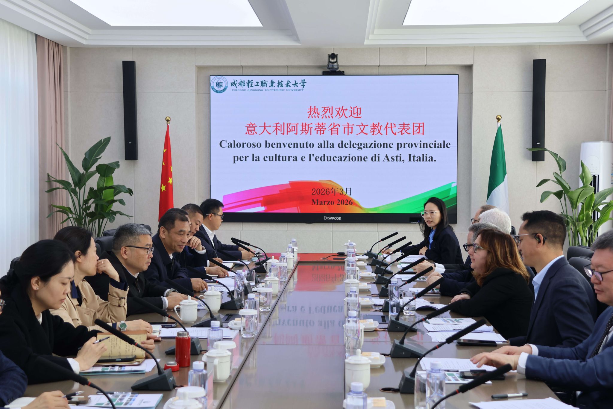 撰稿:李一楠 一审一校:童晓晖 二审二校:孙锐 三审三校:任迎伟 为积极落实中意两国领导人在2024年会晤中达成的关于加强全面战略伙伴关系三年行动计划,进一步深化四川省与意大利在人员互访、文化交流、人文教育等领域的交流合作,3月24日上午,意大利阿斯蒂省市文教代表团一行来校访问,围绕职业教育合作、人文交流及非遗传承等内容开展座谈交流。四川省教育厅对外交流与合作处处长王拉沙,学校任迎伟同志、孙锐同志陪同参观并出席座谈会。学校党政办公室、产教融合与对外交流处及相关二级学院负责人参与座谈交流。