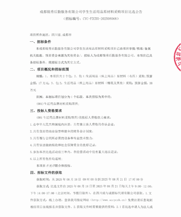 上一条:成纺创业大街 项目征集公告(第二次) (项目编号:CDBYZS2025003) 下一条:成都锦秀后勤服务有限公司2025-2026学年度食堂食品原材料采购项目比选采购公告