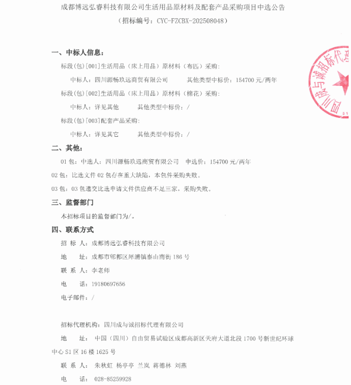 上一条:【更正公告】成都纺织高等专科学校犀浦校区、邛崃产教园区校园生活服务项目 (项目编号:CDJXZS2025007) 下一条:成都博远弘睿科技有限公司军训服原材料及配套产品采购项目中选公告