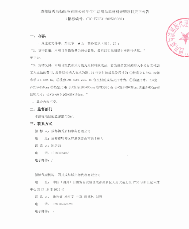上一条:成都锦秀后勤服务有限公司学生生活用品原材料采购项目结果公告 下一条:成都锦秀后勤服务有限公司 厨房抽排系统采购项目结果公告 (项目编号:CDJXCG2025002号)