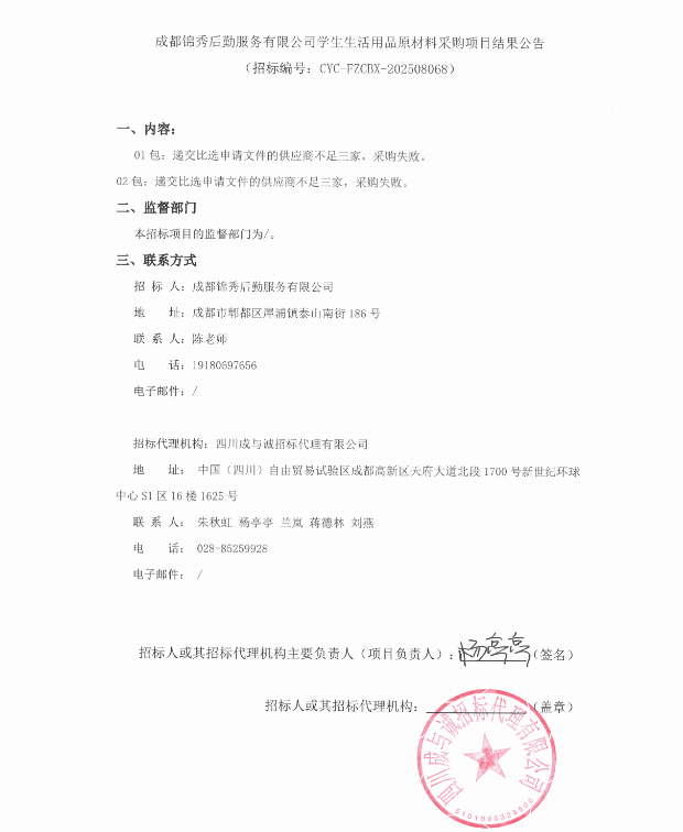 上一条:成都博远弘睿科技有限公司学生生活用品原材料及配套产品采购项目(第二次)更正通知 下一条:成都锦秀后勤服务有限公司学生生活用品原材料采购项目更正公告
