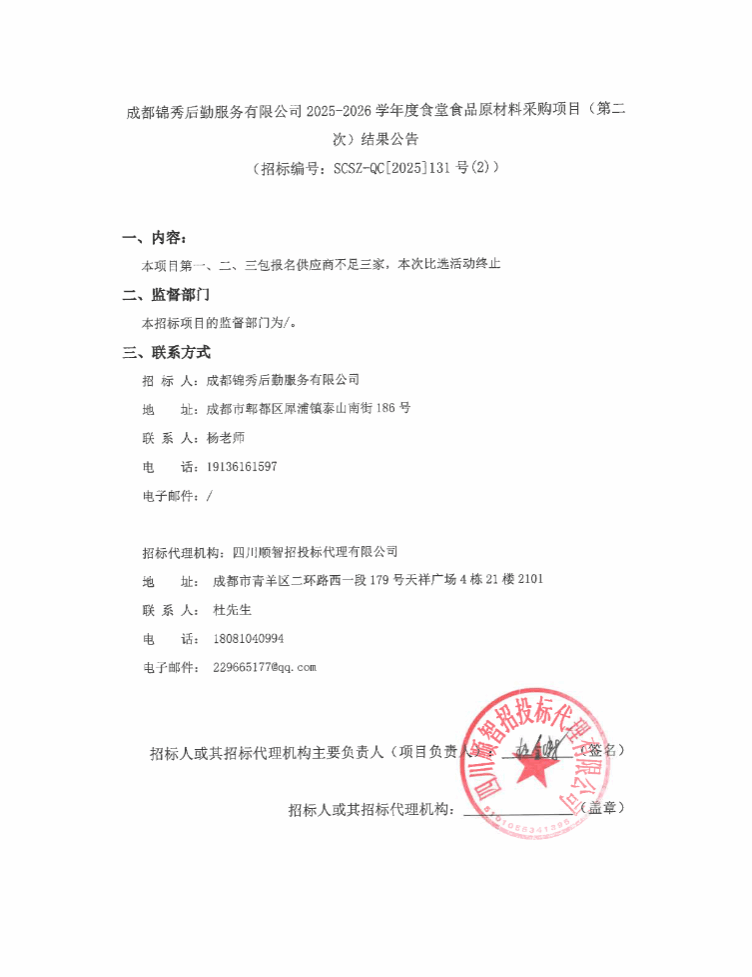 上一条:成都锦秀后勤服务有限公司2025-2026学年度食堂食品原材料采购项目(第三次)比选采购公告 下一条:成都锦秀后勤服务有限公司学生生活用品原材料采购项目(第二次)中选公告