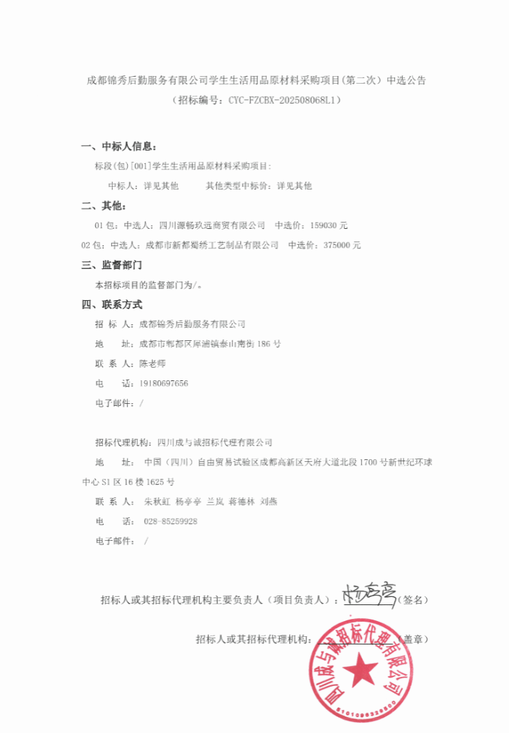 上一条:成都锦秀后勤服务有限公司2025-2026学年度食堂食品原材料采购项目(第二次)结果公告 下一条:成纺创业大街项目征集公告(第三次)(项目编号:CDBYZS2025004)