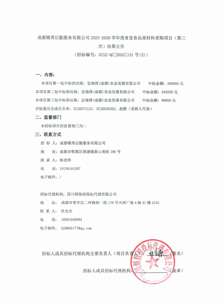 公告链接:https://ctbpsp.com/#/bulletinDetail?uuid=198b6b34-73a6-404f-b43d-1b7c9cc7c857&inpvalue=%E6%88%90%E9%83%BD%E9%94%A6%E7%A7%80%E5%90%8E%E5%8B%A4%E6%9C%8D%E5%8A%A1%E6%9C%89%E9%99%90%E5%85%AC%E5%8F%B82025-2026%E5%AD%A6%E5%B9%B4%E5%BA%A6%E9%A3%9F%E5%A0%82%E9%A3%9F%E5%93%81%E5%8E%9F%E6%9D%90%E6%96%99%E9%87%87%E8%B4%AD%E9%A1%B9%E7%9B%AE&dataSource=0&tenderAgency=