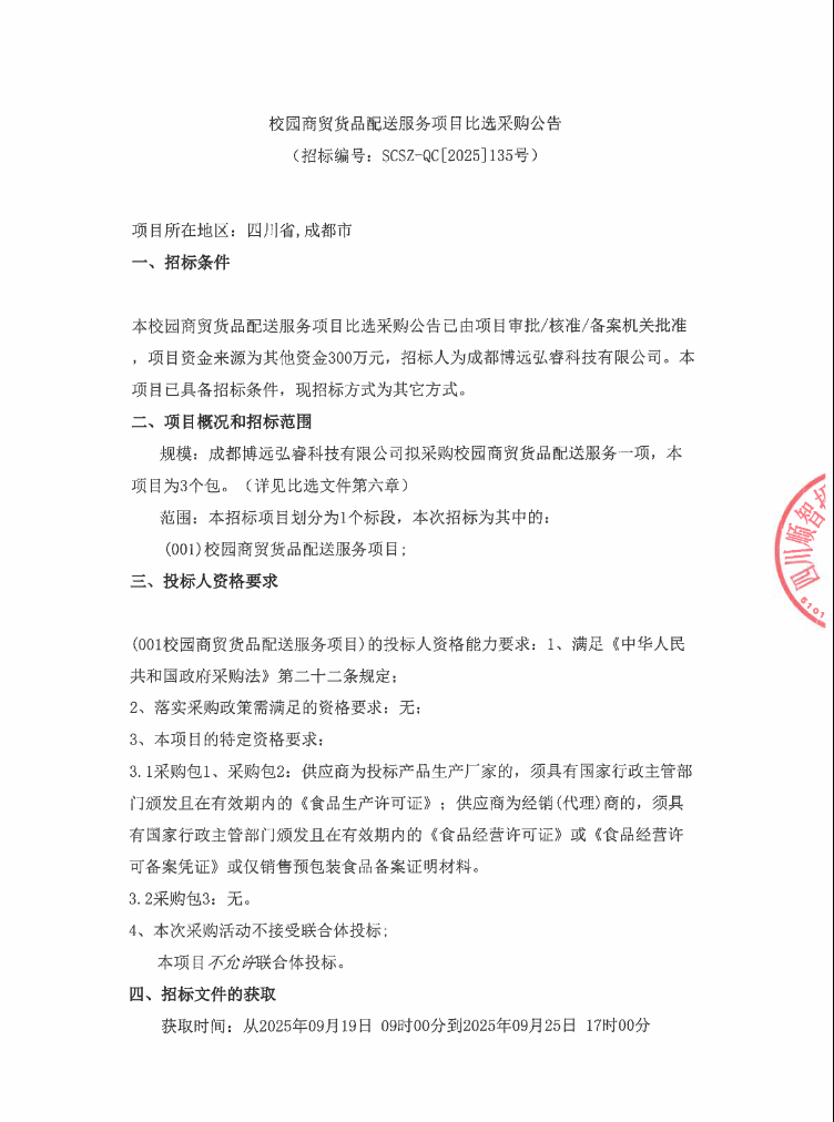 公告链接:https://ctbpsp.com/#/bulletinDetail?uuid=813df5b2-2853-4270-b0ea-0fc3ea2b1794&inpvalue=%E6%A0%A1%E5%9B%AD%E5%95%86%E8%B4%B8%E8%B4%A7%E5%93%81%E9%85%8D%E9%80%81%E6%9C%8D%E5%8A%A1%E9%A1%B9%E7%9B%AE%E6%AF%94%E9%80%89%E9%87%87%E8%B4%AD%E5%85%AC%E5%91%8A&dataSource=0&tenderAgency=