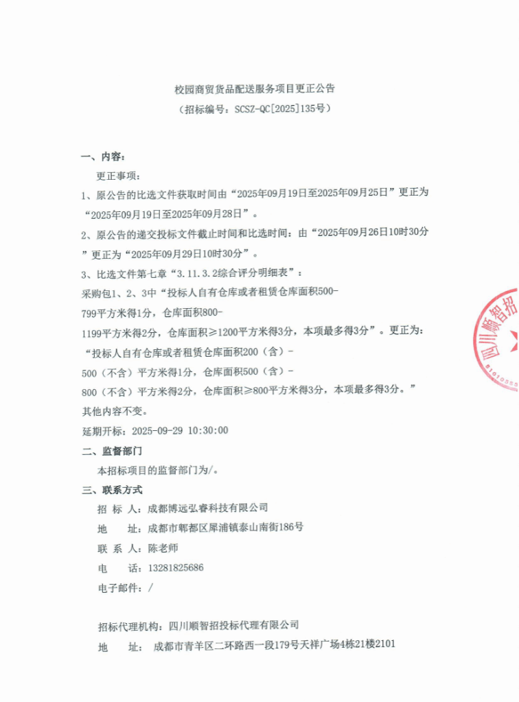 公告链接:https://ctbpsp.com/#/bulletinDetail?uuid=e6cdec7c-007d-440f-9983-2d84c7b8062f&inpvalue=%E6%A0%A1%E5%9B%AD%E5%95%86%E8%B4%B8%E8%B4%A7%E5%93%81%E9%85%8D%E9%80%81%E6%9C%8D%E5%8A%A1%E9%A1%B9%E7%9B%AE%E6%9B%B4%E6%AD%A3%E5%85%AC%E5%91%8A&dataSource=0&tenderAgency=